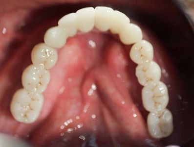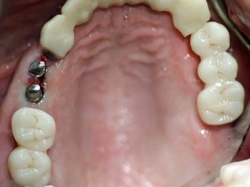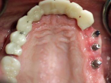 The four anterior abutments were prepared in the mouth with copious irrigation and an impression made.