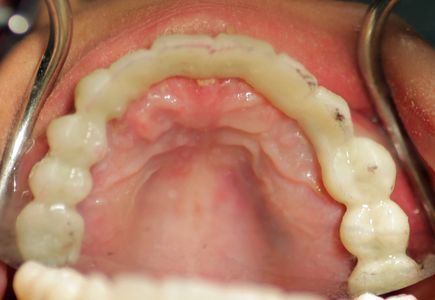 Dr. Gibney checks how the bite between the upper and lower temporary teeth fit. You can see the marks on Cristina's teeth from checking the bite.