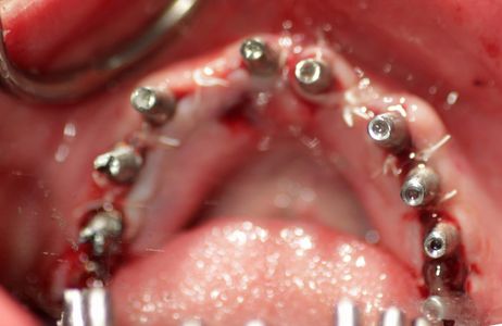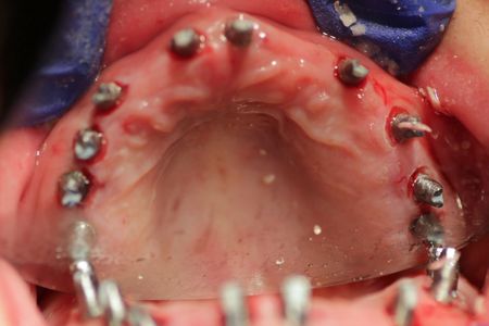 Dr. Gibney surgically implants 10 posts on the top and then 10 posts on the bottom.